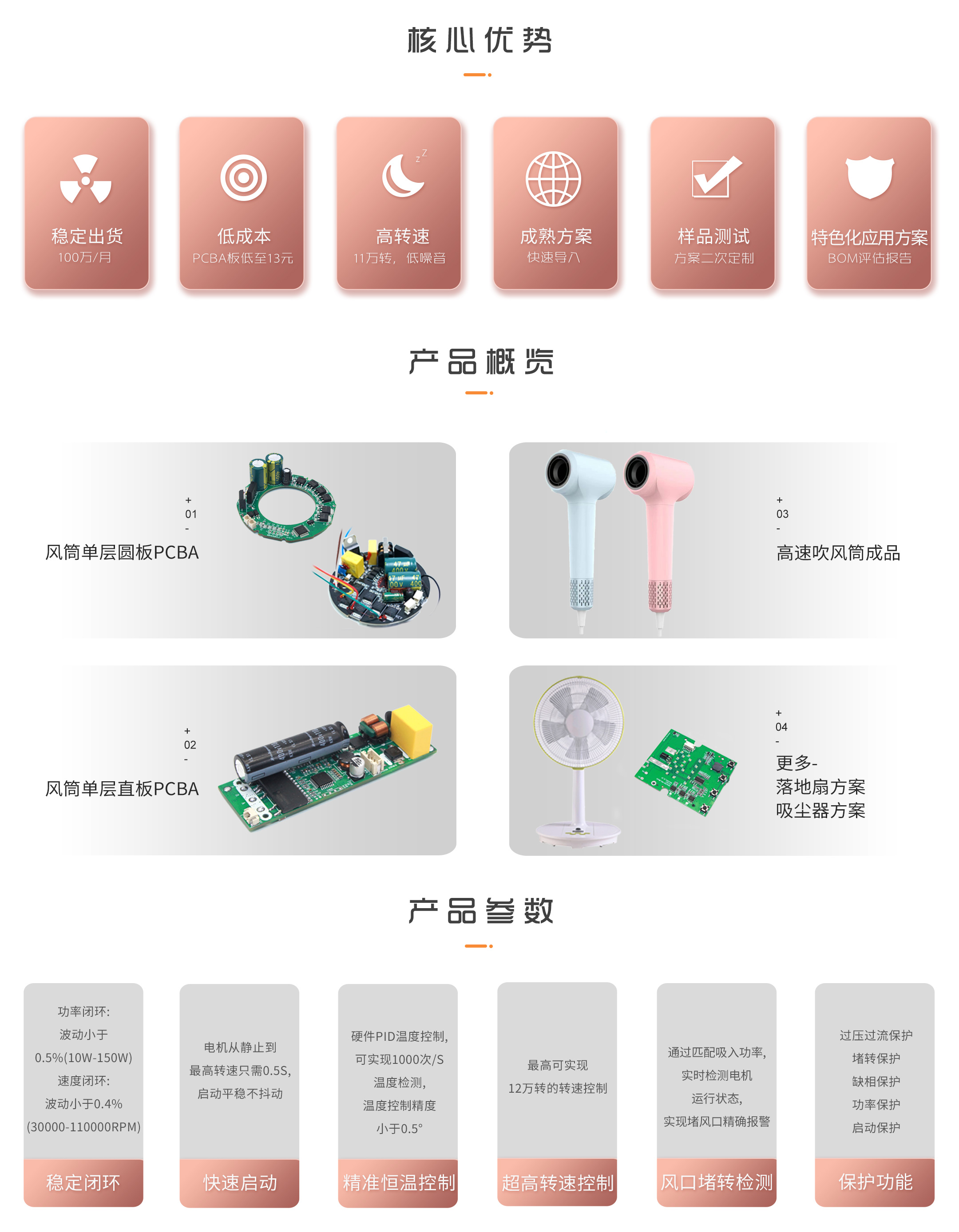 ●啟動(dòng)迅速、噪聲低、可快速插拔操作 ●支持正弦波FOC無刷電機(jī)控制 ●支持多檔風(fēng)力和多檔溫度控制 ●可過3C、EMC、UL或CE等產(chǎn)品認(rèn)證 ●提供風(fēng)道設(shè)計(jì)和結(jié)構(gòu)設(shè)計(jì),快速穩(wěn)定加速項(xiàng)目落地 ●批量穩(wěn)定出貨100萬+ |