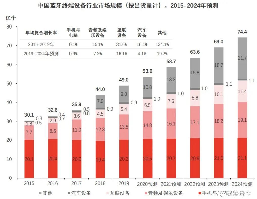 2015年至2020年期間中國藍(lán)牙終端設(shè)備出貨量穩(wěn)步提升,未來伴隨藍(lán)牙芯片在各領(lǐng)域滲透率持續(xù)提升,預(yù)計(jì)至2024年藍(lán)牙終端設(shè)備出貨量將達(dá)74.4億個(gè)。