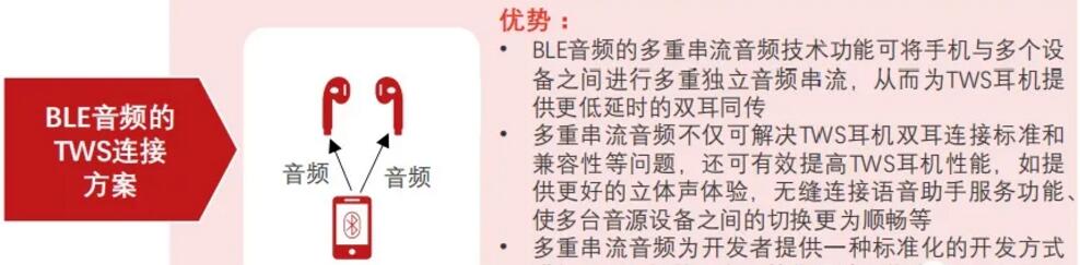 BLEA標準采用多重串流音頻技術(shù),可實現(xiàn)無線多路直聯(lián),單一音頻輸出設(shè)備與一個或多個音頻接收設(shè)備之間,可同步進行多重且獨立的音頻串流傳輸。BLEA標準的頒布打破蘋果TWS專利封鎖,解決TWS耳機雙耳直連的標準問題和兼容性問題,為安卓TWS廠商提供標準化的TWS耳機開發(fā)方式,有助于釋放安卓TWS廠商的生產(chǎn)力。