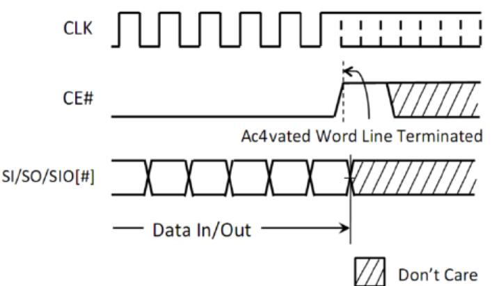 所有所有讀和寫(xiě)都必須由CE#從低到高完成。CK#的上升沿是終止已激活的讀/寫(xiě)字線(xiàn)并將設(shè)備設(shè)置為待機(jī)狀態(tài)的觸發(fā)器,否則將阻止內(nèi)部刷新操作,直到設(shè)備看到讀/寫(xiě)字線(xiàn)已終止,無(wú)需執(zhí)行命令終止操作僅適用于讀取和寫(xiě)入操作以及任何命令操作,例如Enter Quad模式命令和Reset命令。