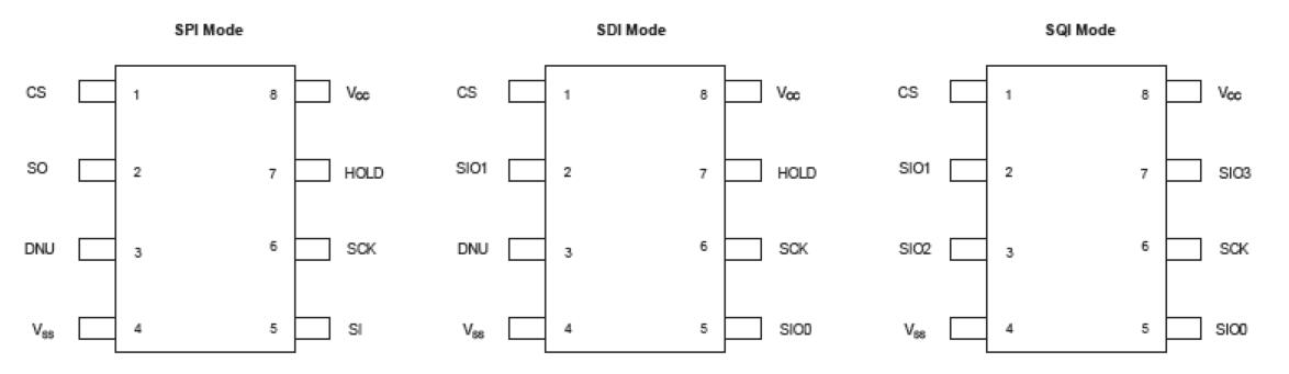 與兼容的主設(shè)備一起使用時,該設(shè)備還支持SDI(串行雙接口)和SQI(串行四接口)操作模式。要進(jìn)入SDI模式,必須輸入ESDI命令(3Bh)。按照SDI操作模式的慣例,每個時鐘使用SIO0和SIO1引腳輸入兩位。位首先以MSB時鐘輸入。要進(jìn)入SQI模式,必須輸入ESQI命令(38h)。對于SQI操作模式,每個時鐘輸入4位數(shù)據(jù),或者每個時鐘輸入1個半字節(jié)。半字節(jié)首先由MSB提供時鐘。