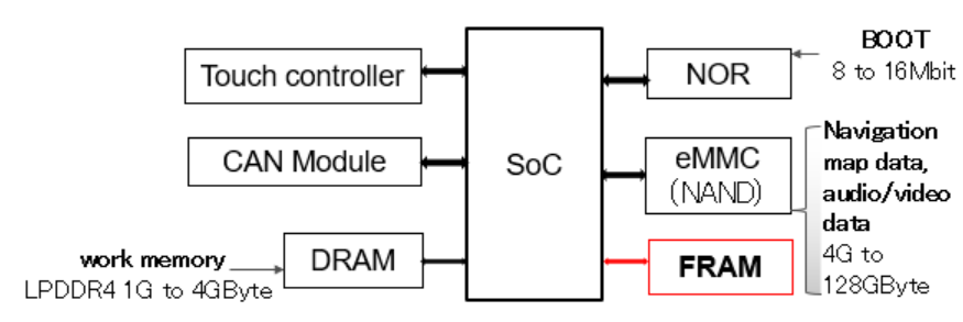 環(huán)境傳感器&攝像,車(chē)聯(lián)網(wǎng)通信技術(shù)和人工智能決策平臺(tái)是自動(dòng)駕駛技術(shù)的核心技術(shù)。傳感器,CAN通信,infotainment這些系統(tǒng)需要實(shí)時(shí)和持續(xù)地存儲(chǔ)當(dāng)前狀態(tài)信息,并進(jìn)行實(shí)時(shí)分析和處理。因此需要提高存儲(chǔ)器的性能和耐久性設(shè)計(jì),這些要求使FRAM成為理想的存儲(chǔ)選擇。
