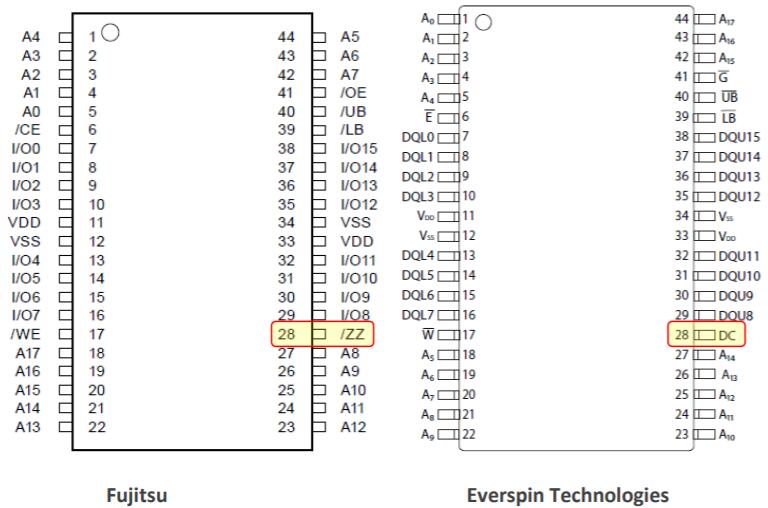 MRAM,組織為256kx16,由標(biāo)稱3.3V電源供電,并與FRAM兼容。兩款產(chǎn)品均使用標(biāo)準(zhǔn)SRAM并行地址(A0-16)、字節(jié)寬雙向數(shù)據(jù)引腳(DQ0-7)和控制信號(hào)(/E、/W、/G)。每個(gè)都可以由一個(gè)公共定時(shí)接口支持,并將用作隨機(jī)存取讀/寫存儲(chǔ)器,在斷電時(shí)無(wú)需外部電池即可保留數(shù)據(jù)。Everspin不支持/ZZ睡眠功能。/ZZ可能需要上拉。