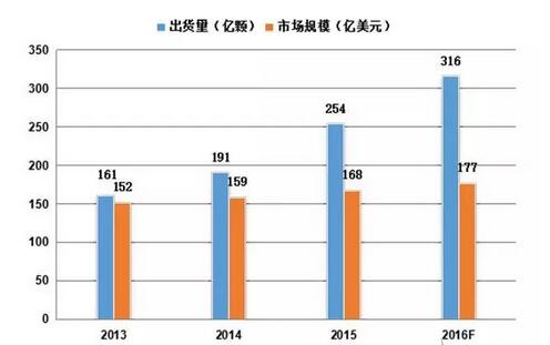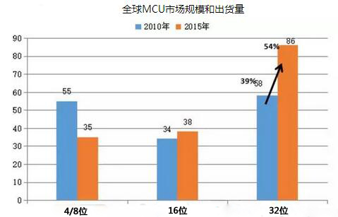 IC Insights研究報告顯示,2015年全球MCU市場規(guī)模達(dá)到168億美元,較去年增長5.6%,出貨量255億顆比去年提升12.4%,預(yù)計2016年全球MCU市場出貨量將突破300億顆大關(guān)。其中,2015年全球32位MCU出貨量超過4/8位MCU與16位MCU出貨量的總和,而且未來幾年應(yīng)該會保持30%左右的高速增長的水平。