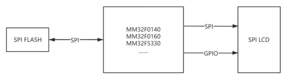 靈動微推出的SPI LCD顯示參考方案,通過SPI接口讀取外部SPI FLASH存儲芯片中存儲的字體、圖片等數(shù)據(jù)資源,再通過另外一路SPI驅(qū)動SPI LCD彩屏顯示。對于不同尺寸、不同分辨率的 SPI LCD 彩屏,客戶可以選擇靈動微電子不同規(guī)格的MCU來實現(xiàn)刷屏效果,硬件設計框圖如下所示: