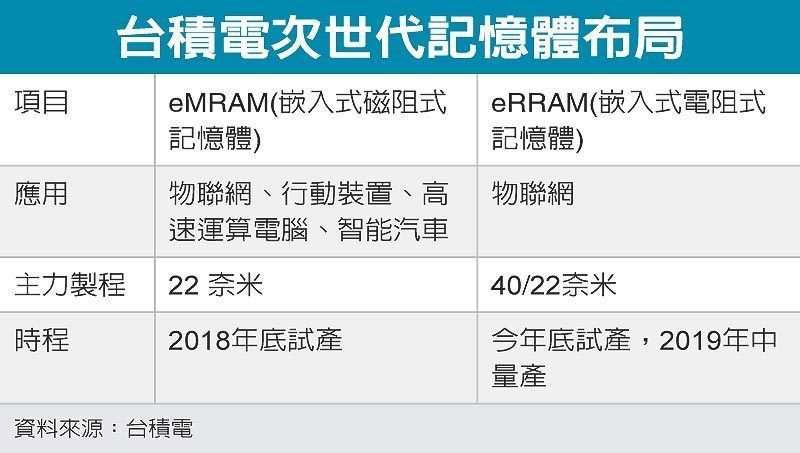 臺(tái)積電技術(shù)長(zhǎng)孫元成近日在臺(tái)積電技術(shù)論壇上,第一次披露臺(tái)積電研發(fā)多年的eMRAM(嵌入式磁阻式隨機(jī)存取內(nèi)存)和eRRAM(嵌入式電阻式內(nèi)存),分別定于明后年實(shí)行風(fēng)險(xiǎn)性試產(chǎn),主要使用22mn制程,這將是臺(tái)積電因應(yīng)高速運(yùn)算計(jì)算機(jī)、物聯(lián)網(wǎng)、行動(dòng)裝置和智能汽車(chē)等四領(lǐng)域所供給效能更迅速和耗電更低的新內(nèi)存。