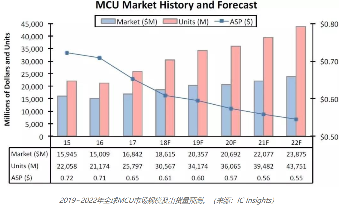 據(jù)IC Insights研究報告預測,2019年全球MCU市場規(guī)模將達204億美元、出貨量達到342億顆,不過平均售價(ASP)將持續(xù)下降。