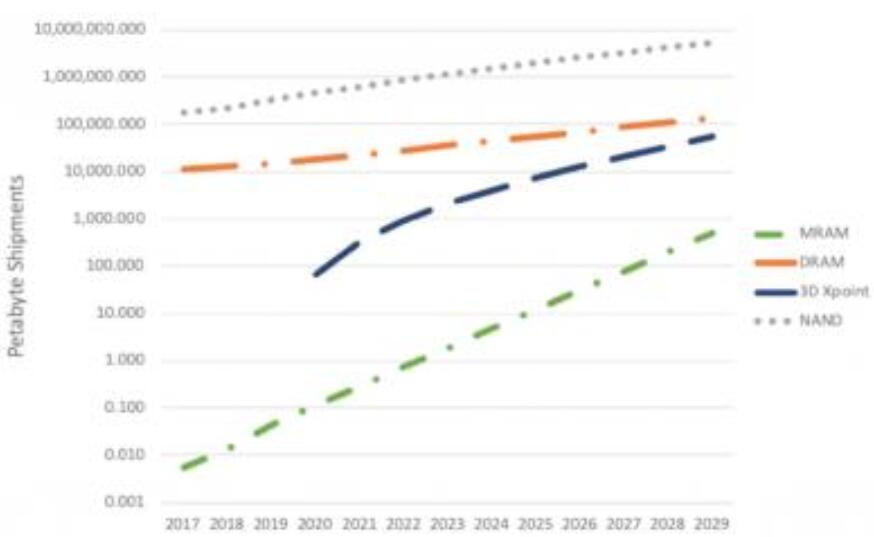 MRAM容量出貨量預(yù)測(cè)(2017-2029,Coughlin)分析人士預(yù)計(jì),包括DRAM,3DXpoint和NAND在內(nèi)的許多存儲(chǔ)技術(shù)將在未來幾年內(nèi)增長,但增長最快的將是MRAM存儲(chǔ)器。容量方面的出貨量預(yù)計(jì)將從2019年的約0.1PB增長到2029年的近100PB。