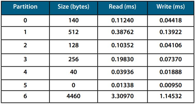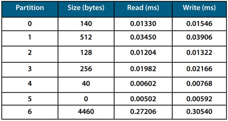 MRAM低級驅(qū)動程序通過操作系統(tǒng)和調(diào)度程序集成到動力總成應(yīng)用程序中。讀寫周期由系統(tǒng)時鐘(300MHz)測量。圖1&2顯示了針對動力總成應(yīng)用的具有不同非易失性存儲器接口的每個分區(qū)的讀/寫時間。這些表顯示大多數(shù)讀/寫周期小于2ms。毫不奇怪,該表確認(rèn)35ns并行接口以比40MHz