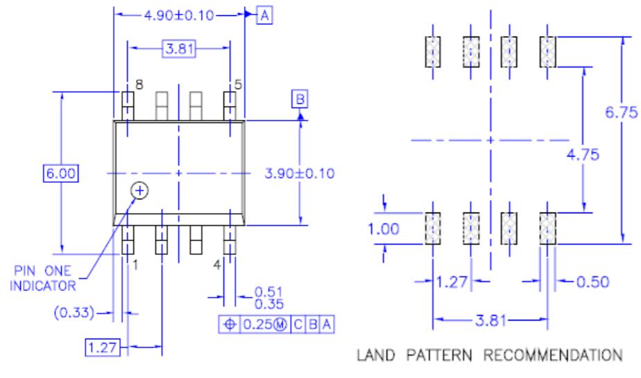 圖1代表了JEDEC標(biāo)準(zhǔn)SOIC-8封裝的近似尺寸和建議的PCB焊盤(pán)圖案(注意:以下尺寸為近似值,可能因供應(yīng)商而異)
