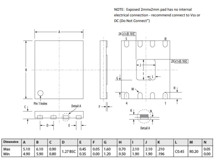 MR25HxxxDC(4.1mm裸露的底部焊盤(pán))和MR25HxxxDF(2.0mm裸露的底部焊盤(pán))的封裝尺寸。由于MR25HxxxDC的4.1mm裸露底墊與SOIC-8 PCB焊盤(pán)圖案之間存在邊際間隙,因此具有2.0mm裸露底墊(MR25HxxxDF)的新封裝已獲Everspin批準(zhǔn)生產(chǎn),并且與JEDEC兼容標(biāo)準(zhǔn)SOIC-8和DFN-8焊盤(pán)圖案。較小的底墊在底墊和SOIC-8的PCB焊盤(pán)圖案之間提供足夠的間隙。