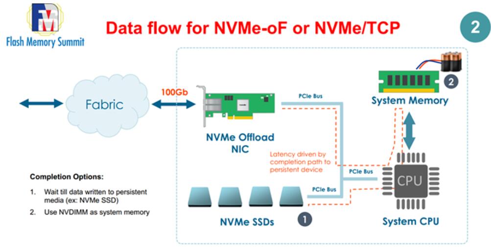 以下圖片是傳統(tǒng)的NVMe-oF的數(shù)據(jù)流,要通過系統(tǒng)內(nèi)存和CPU再進(jìn)入NVMe SSD,這樣會(huì)導(dǎo)致讀寫延遲比較長(zhǎng)。