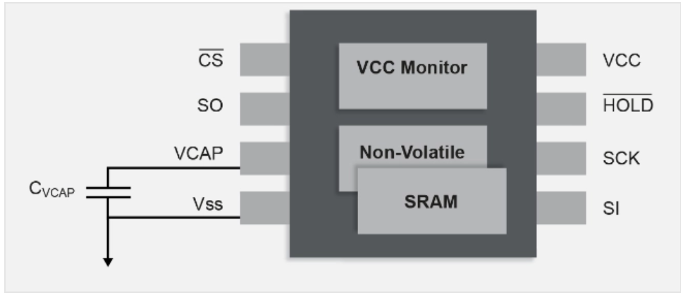 串行SRAM,在器件內(nèi)部的每個單元中都包含非易失性晶體管。與NVSRAM不同,它不需要外部電池。它使用一個小的外部電容器來提供當(dāng)系統(tǒng)斷電時將SRAM的內(nèi)容移動到非易失性單元所需的能量,這是通過IC監(jiān)視公共集電極上的電壓并自動處理SRAM和SRAM之間的數(shù)據(jù)移動來實(shí)現(xiàn)的。必要時使用非易失性存儲器。