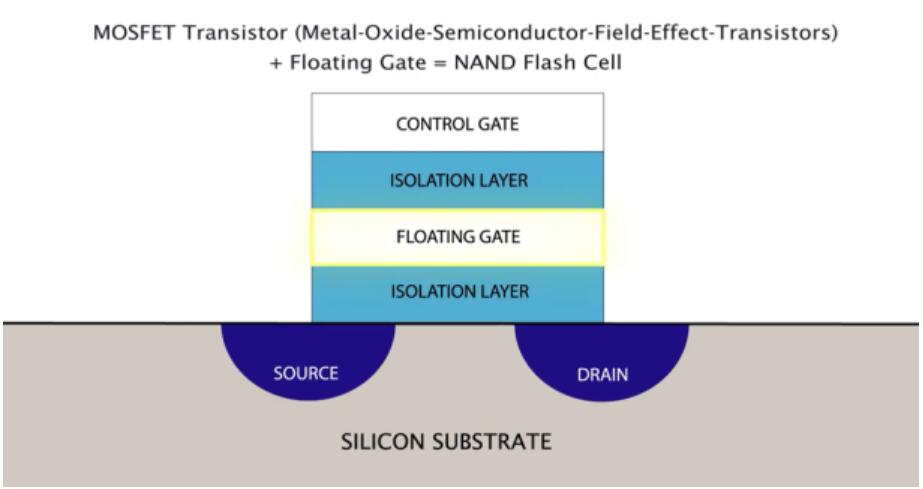閃存單元由修改的場效應(yīng)晶體管(FET)組成,在控制柵極和通道之間的絕緣層中具有額外的“浮置”柵極。通過施加高壓將電荷注入到浮柵上(或從浮柵上去除)。這會改變打開晶體管所需的柵極電壓,該電壓代表存儲在單元中的值。這些單元的陣列構(gòu)成一個塊,整個存儲器由多個塊組成。