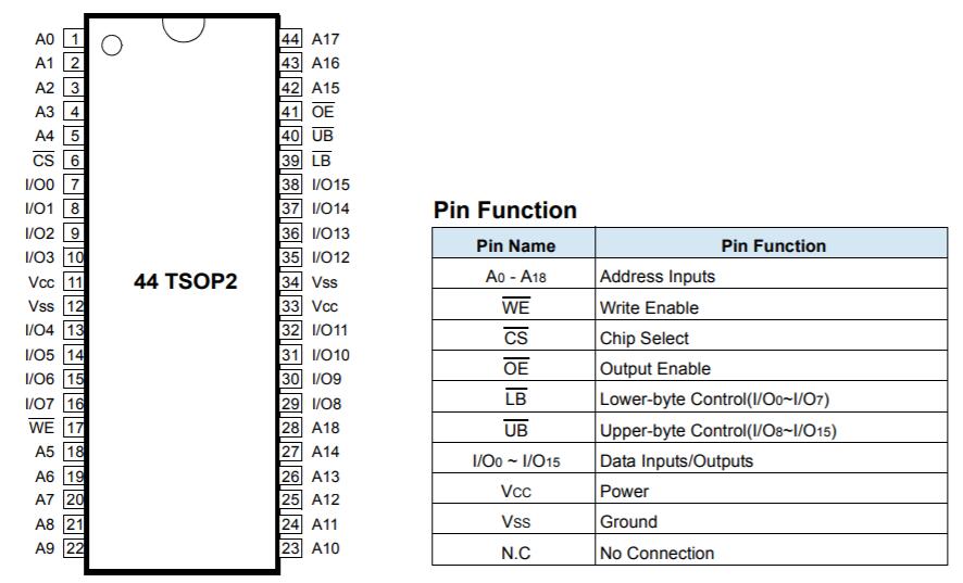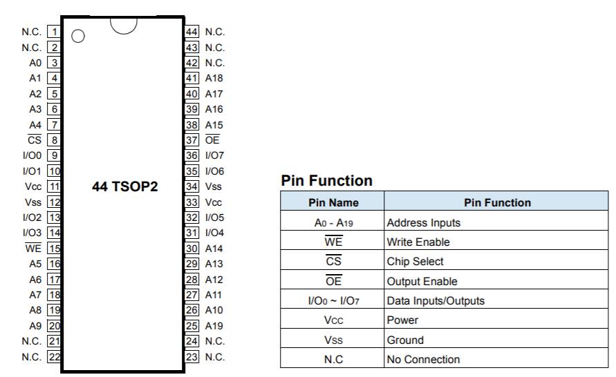 •標(biāo)準(zhǔn)的44TSOP2和48FBGA封裝引腳配置。