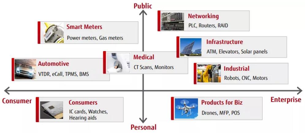 經(jīng)過市場的長期廣泛驗證以及技術的不斷突破,富士通FRAM產(chǎn)品已成功應用于智能卡及IC卡等卡片領域、電力儀表及產(chǎn)業(yè)設備等工業(yè)領域,醫(yī)療設備及醫(yī)療RFID標簽等醫(yī)療領域、胎壓監(jiān)測及新能源汽車電池管理系統(tǒng)等汽車領域等等,涉及的應用超過200種,幾乎覆蓋所有主要領域!
