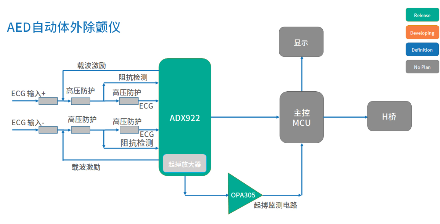 自動體外除顫器(AED)是心臟驟停急救中快速對患者心臟實施電擊來達到除顫,可以幫助普通人快速實施除顫。類比的ECG模擬前端可以快速準確地監(jiān)控患者的心臟狀態(tài),來實施準確高效的除顫效果。