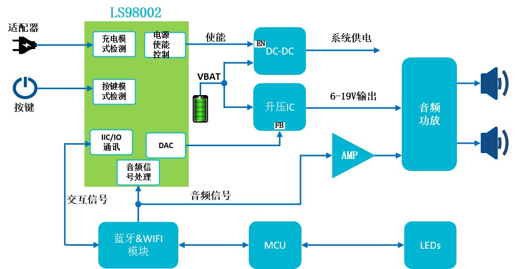 現(xiàn)場可重構IC、通用可配置的模數(shù)混合芯片內部集成豐富的模擬資源和數(shù)字資源,可輕松替代電路中的各種標準器件,并按照客戶要求組合成最優(yōu)小型ASIC,縮短開發(fā)周期,降低成本。下面介紹LS98002現(xiàn)場可重構CPLD芯片應用案例—藍牙音箱。