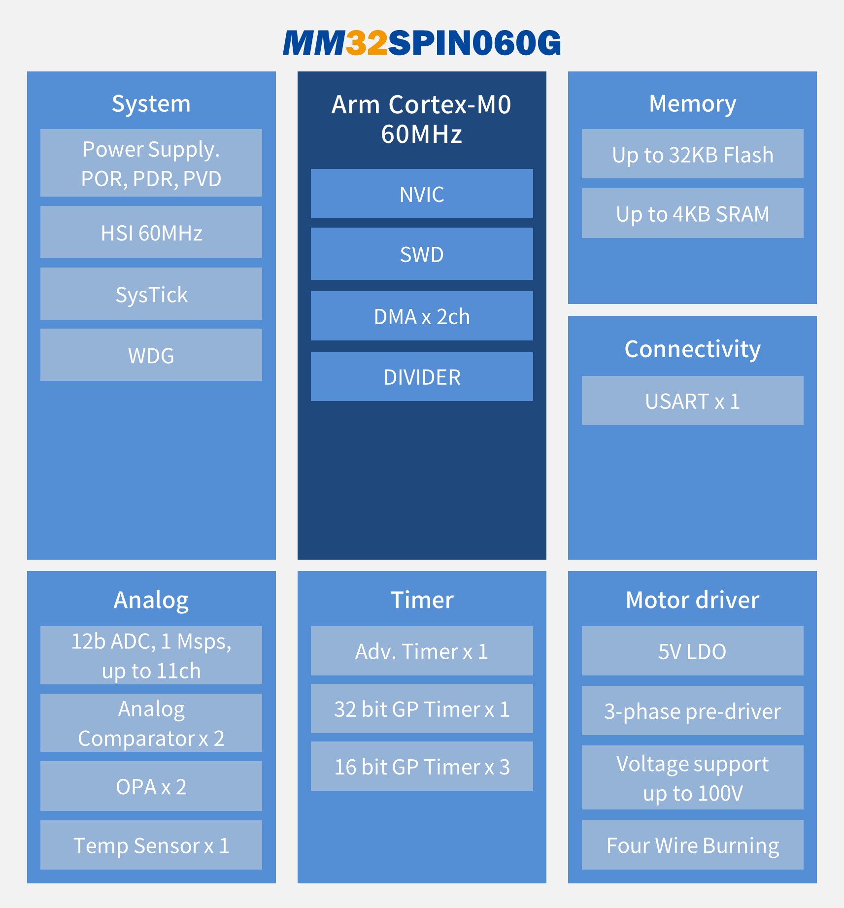 MM32SPIN060G存儲(chǔ)及運(yùn)算資源:32KB Flash,4KB SRAM,最高主頻60MHz,7個(gè)定時(shí)器資源:1個(gè)16位高級(jí)定時(shí)器、1個(gè)32位通用定時(shí)器、3個(gè)基本定時(shí)器、1個(gè)12位IWDG、1個(gè)24位Systick,支持2通道DMA,硬件除法器HW-Div,1路12位模數(shù)轉(zhuǎn)換器ADC,支持7通道,采樣速率1Msps,2路模擬比較器COMP、2路軌對(duì)軌運(yùn)算放大器OPAMP,三相N溝道柵極驅(qū)動(dòng)器,支持UART/SPI通信,內(nèi)部LDO支持工作范圍5.5~18V,預(yù)驅(qū)工作電壓高達(dá)100V,支持四線燒錄功能,工作環(huán)境溫度-40℃~105℃,提供QFN32封裝。適用于多種應(yīng)用場(chǎng)合,包括服務(wù)器風(fēng)機(jī)、泵類(lèi)、風(fēng)機(jī)類(lèi)、PWM通信控制電機(jī)應(yīng)用等。更多詳情請(qǐng)洽官方代理英尚微。