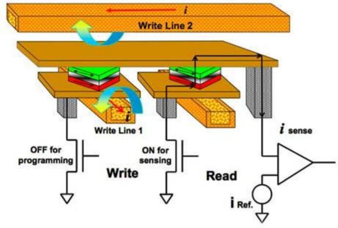 MRAM或磁性隨機存取存儲器使用1晶體管–1磁性隧道結(jié)(1T-1MTJ)架構(gòu),其中鐵磁材料的磁性“狀態(tài)”作為數(shù)據(jù)存儲元素。由于MRAM使用磁性狀態(tài)進行存儲(而不是隨時間推移而“泄漏”的電荷),因此