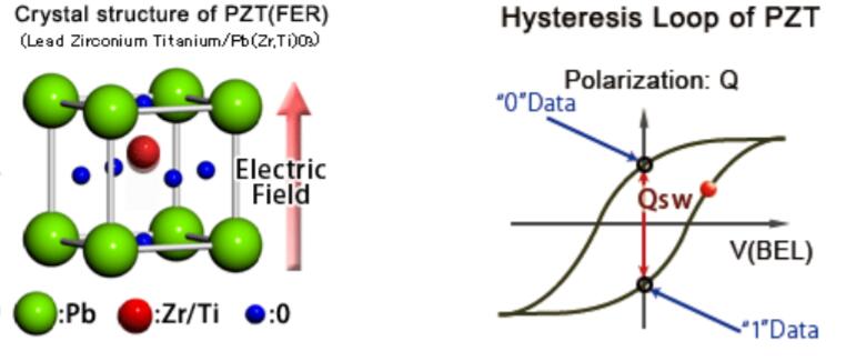 FRAM或鐵電隨機存取存儲器使用1個晶體管–1個鐵電電容器(1T-1FC)架構(gòu),該架構(gòu)采用鐵電材料作為存儲設(shè)備。這些材料的固有電偶極子在外部電場的作用下轉(zhuǎn)換為相反極性。改變鐵電極化態(tài)需要偶極子(位于氧八面體中的Ti4+離子)移動(在Pb(Zr,Ti)O3的情況下)對電場的響應(yīng)(圖4)。自由電荷或其他隨時間和溫度累積的離子缺陷會阻止這種運動,這些缺陷會導(dǎo)致偶極子隨時間松弛,從而導(dǎo)致疲勞。