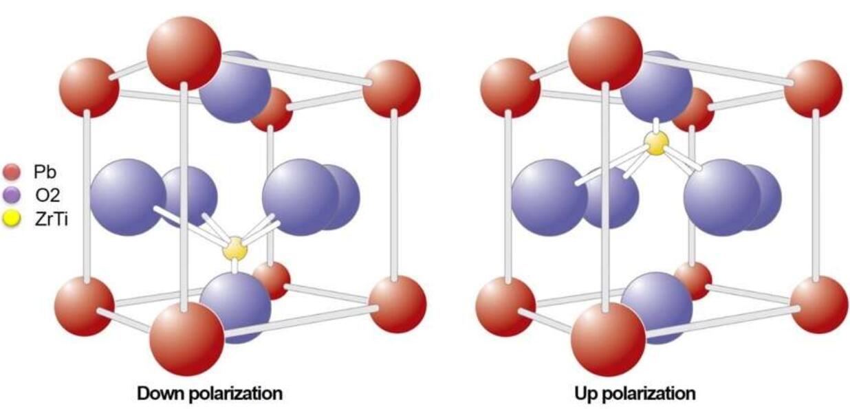 這些吸引人的特性是鋯鈦酸鉛(PZT)是其中一種材料的鐵電性能的結(jié)果。PZT具有鈣鈦礦晶體結(jié)構(gòu),中心有一個(gè)陽(yáng)離子(見圖1)。該陽(yáng)離子可以處于兩個(gè)位置之一,并且可以通過(guò)施加電場(chǎng)來(lái)切換位置。每個(gè)轉(zhuǎn)換都會(huì)產(chǎn)生“開關(guān)電荷”(Q s),可以將其讀取以表示邏輯1或0。