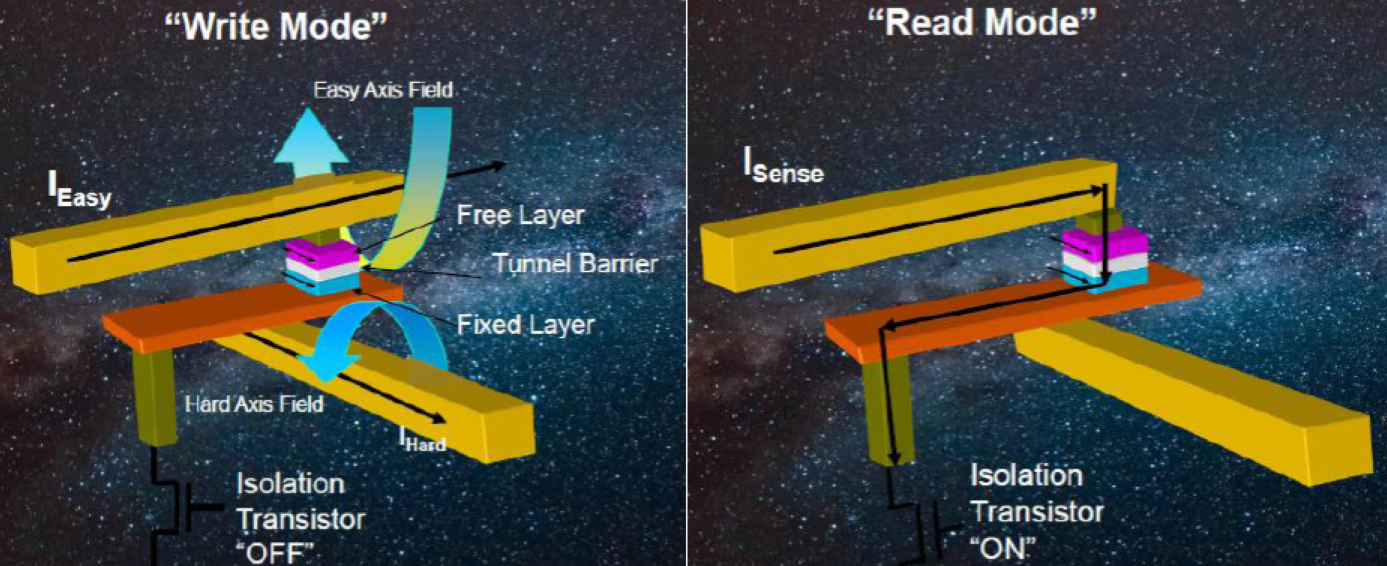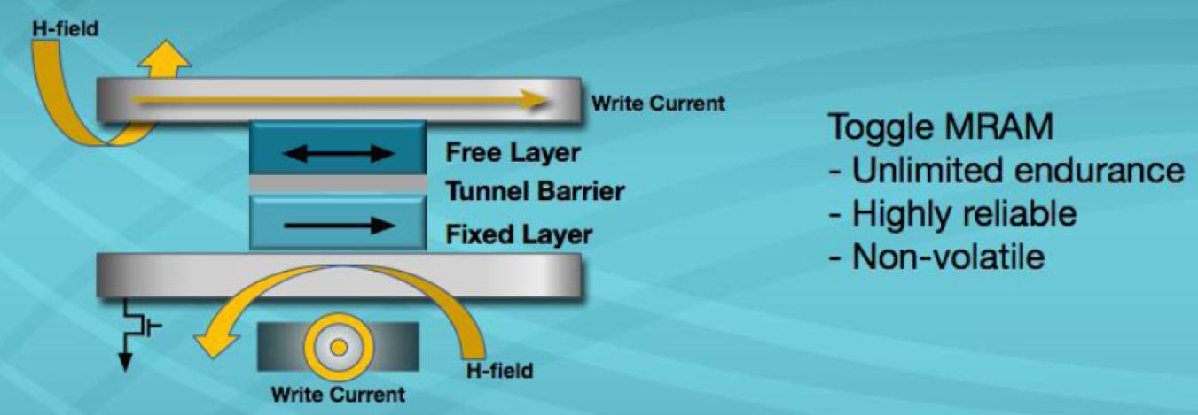 MRAM或磁性隨機(jī)存取存儲(chǔ)器使用具有鐵磁性材料的磁性“狀態(tài)”的1晶體管–1磁性隧道結(jié)(1T-1MTJ)體系結(jié)構(gòu)作為數(shù)據(jù)存儲(chǔ)元素。由于MRAM使用磁性狀態(tài)進(jìn)行存儲(chǔ)(而不是隨時(shí)間推移而“泄漏”的電荷),因此MRAM提供了相當(dāng)長(zhǎng)的數(shù)據(jù)保留時(shí)間(+20年)和無(wú)限的耐用性。切換磁極化(寫入周期)是在電磁隧道結(jié)(MTJ)上方和下方的導(dǎo)線中產(chǎn)生脈沖電流的結(jié)果(見圖1)。電流脈沖產(chǎn)生的相關(guān)H場(chǎng)改變了鐵磁材料自由層的極化,這種磁開關(guān)不需要原子或電子的位移,這意味著沒有與MRAM相關(guān)的磨損機(jī)制。自由層相對(duì)于固定層的磁矩改變了MTJ的阻抗(見圖2)。阻抗的這種變化表示數(shù)據(jù)的狀態(tài)(“1”或“0”)。通過(guò)測(cè)量MTJ的阻抗來(lái)實(shí)現(xiàn)傳感(讀取周期)(圖3)。MRAM器件中的讀取周期是非破壞性的,并且相對(duì)較快(35ns)。讀取操作是通過(guò)在MTJ兩端施加非常低的電壓來(lái)完成的,從而在部件壽命內(nèi)支持無(wú)限的操作。