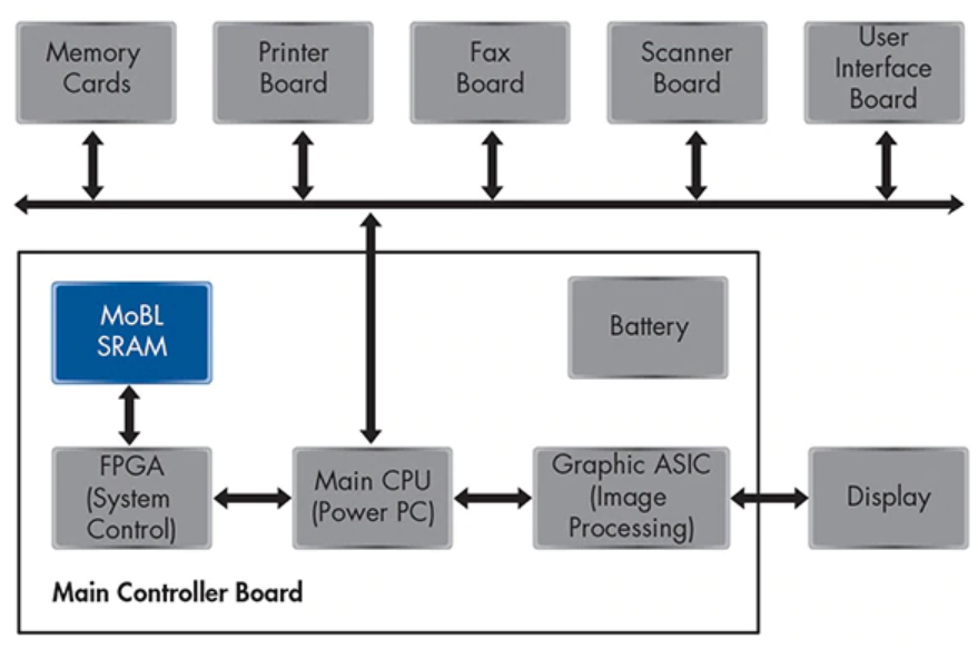 多功能打印機(jī)(MFP)是MoBL®SRAM器件的主要應(yīng)用領(lǐng)域。多種數(shù)據(jù)永久或臨時(shí)存儲(chǔ)在MFP內(nèi)存中。硬盤驅(qū)動(dòng)器(HDD)或閃存驅(qū)動(dòng)器存儲(chǔ)各種類型的用戶信息,而用戶工具設(shè)置,網(wǎng)絡(luò)設(shè)置和配置數(shù)據(jù)則存儲(chǔ)在專用的MoBL®SRAM中。SRAM還用于作業(yè)狀態(tài)和字體表。數(shù)據(jù)對(duì)于設(shè)備的運(yùn)行至關(guān)重要,并通過電池的電源循環(huán)進(jìn)行保護(hù)。因此,MFP設(shè)計(jì)需要具有高可靠性和低錯(cuò)誤率的