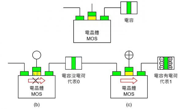 DRAM 使用一個(gè)電晶體(MOS)與一個(gè)電容來儲(chǔ)存一個(gè)位的資料(一個(gè) 0 或一個(gè) 1),如圖四(a)所示,當(dāng)電晶體(MOS)不導(dǎo)通時(shí)沒有電子流過,電容沒有電荷,代表這一個(gè)位的資料是 0,如圖四(b)所示;當(dāng)電晶體(MOS)導(dǎo)通時(shí)(在閘極施加正電壓),電子會(huì)由源極流向汲極,電容有電荷,代表這一個(gè)位的資料是 1,為了要將這些流過來的電荷“儲(chǔ)存起來”,因此必須使用一個(gè)微小的電容,如圖四(c)所示,DRAM 就是因?yàn)殡娙菪枰獣r(shí)間充電,所以速度比 SRAM 還慢。