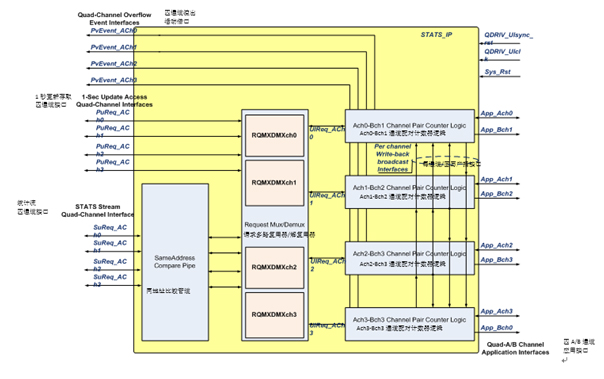 圖2中的STATS_IP架構(gòu)模塊圖標(biāo)出了三個(gè)子部件:每條通道的同地址比較管道(SACOMP)區(qū)塊、請(qǐng)求-復(fù)用-解復(fù)用(REQ_MXDMX_CHn)區(qū)塊以及每條QDR IV應(yīng)用通道1個(gè)的4個(gè)A-B通道配對(duì)計(jì)數(shù)器邏輯(ABCH_CTRL_CHn)區(qū)塊實(shí)例。