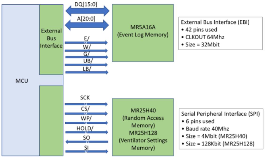 至少4Mb (MR25H40)的MRAM可用于存儲操作軟件程序變量。存儲在MRAM的數(shù)據(jù)在呼吸機關閉期間保存。